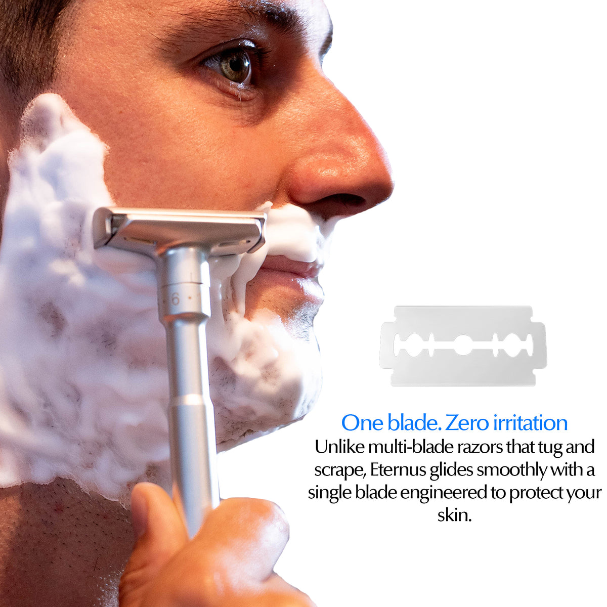Precision-engineered metal razor with dial control for a close, comfortable shave.