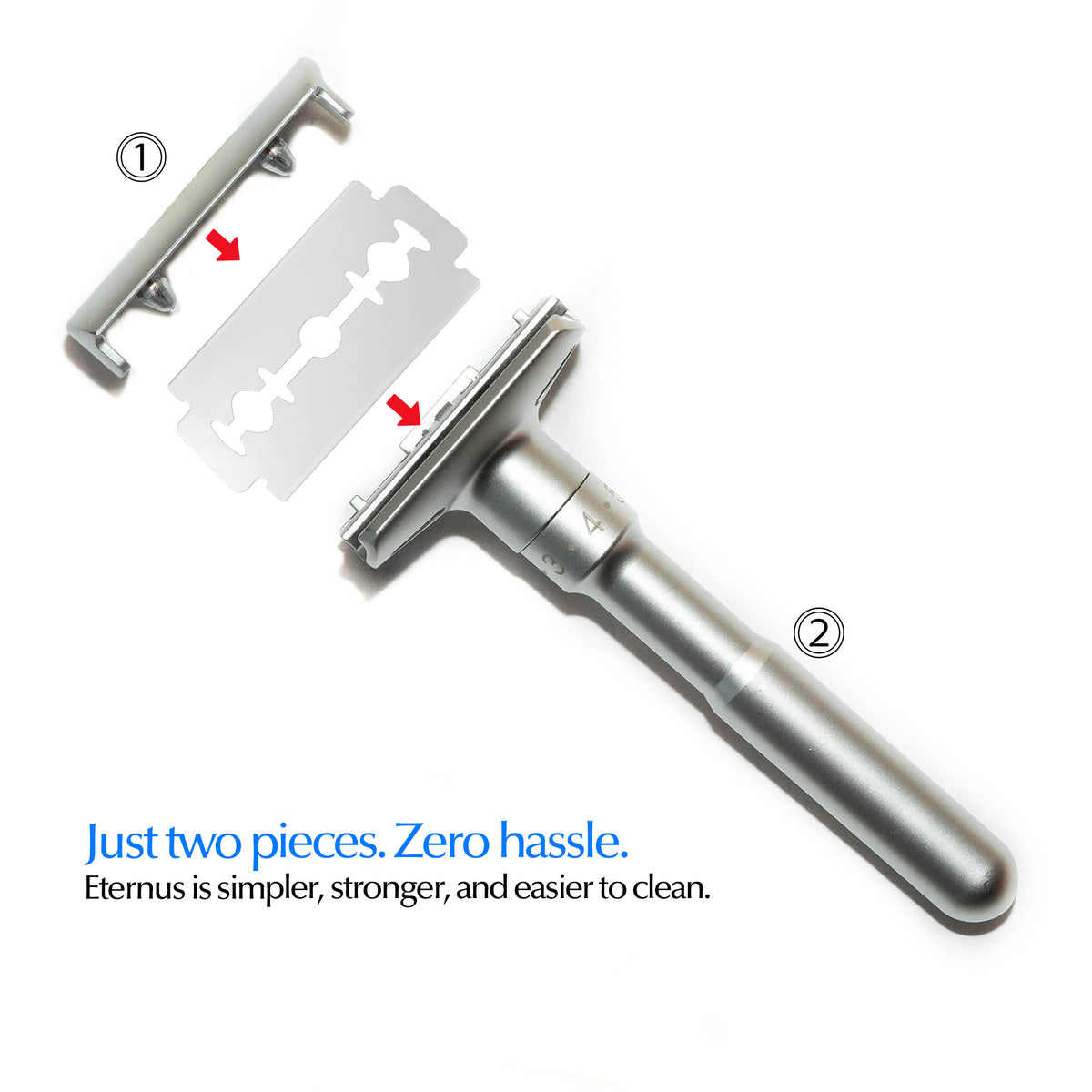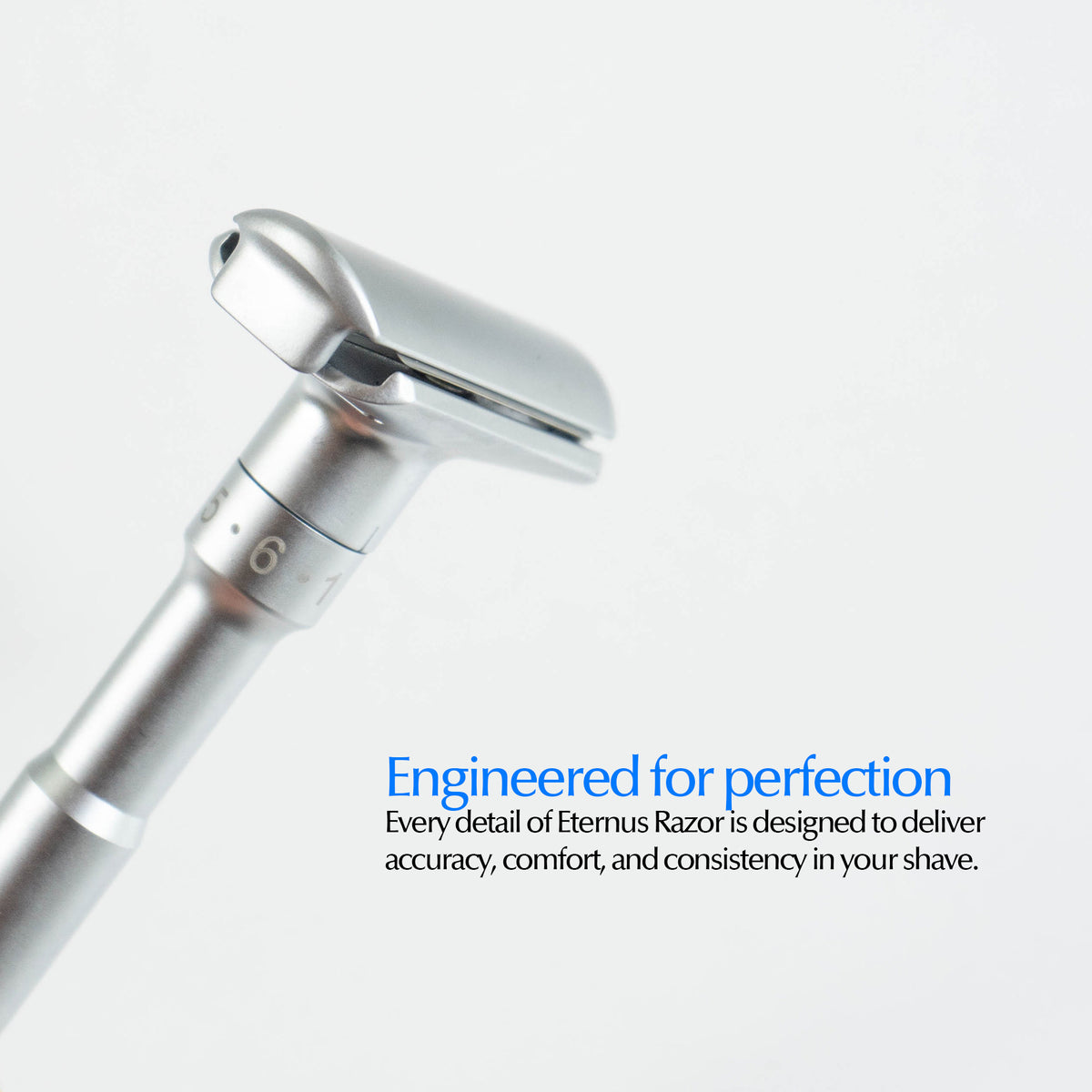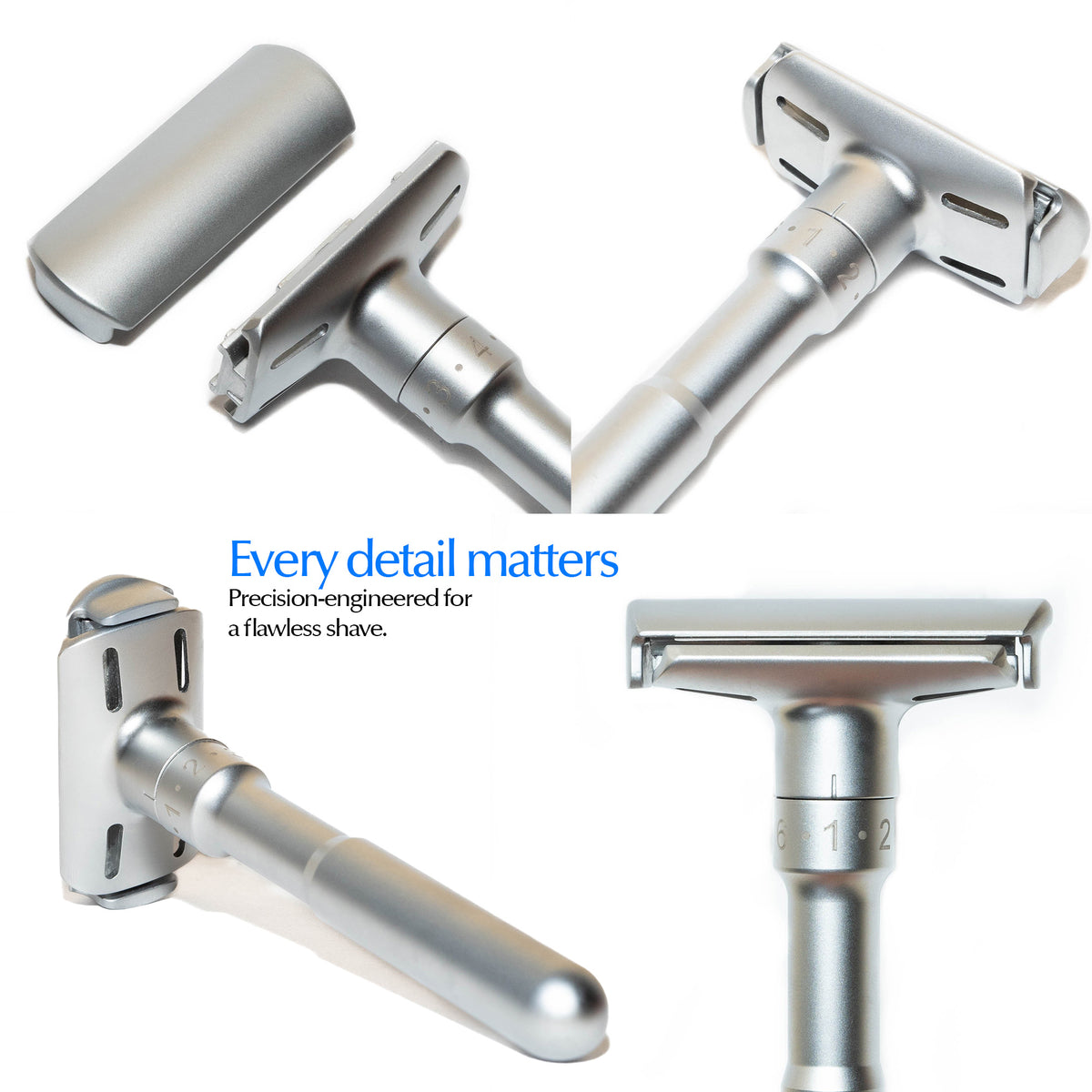 Precision-engineered metal razor with dial control for a close, comfortable shave.